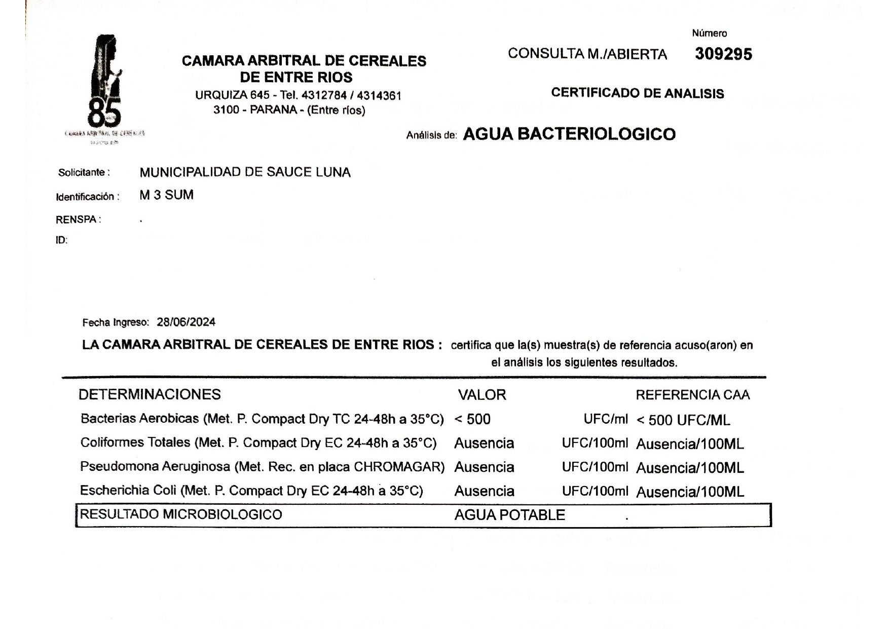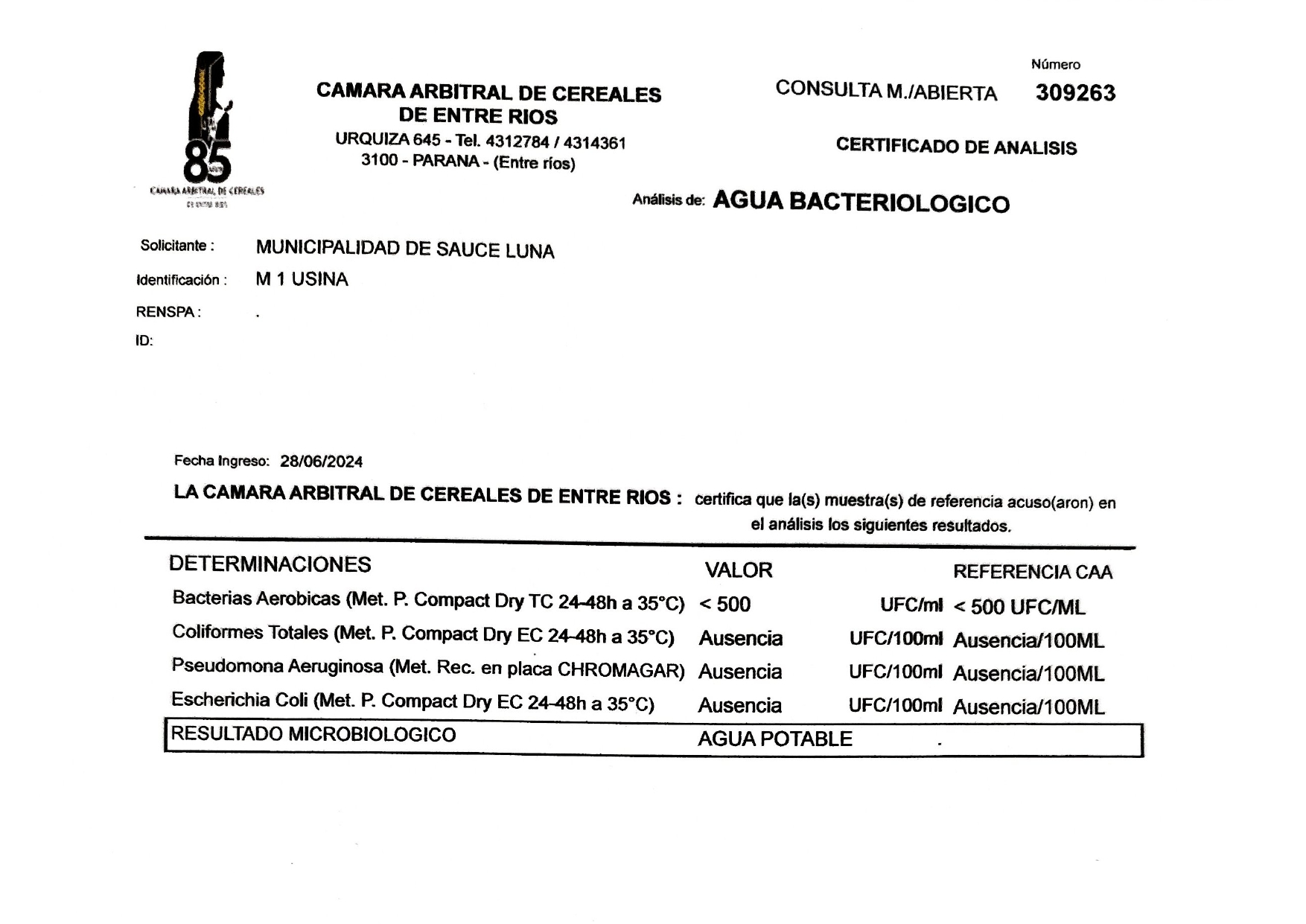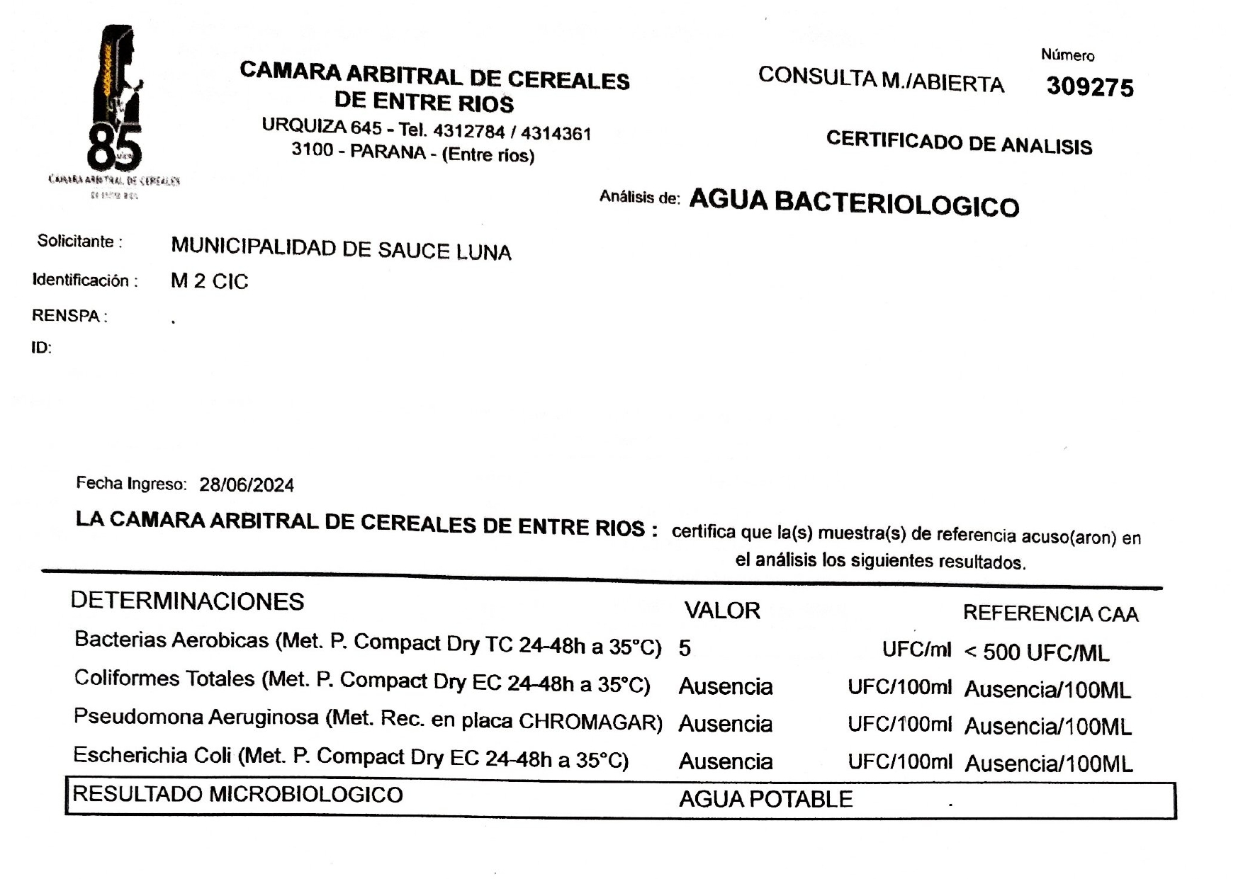 De acuerdo a la solicitud del Municipio de Sauce de Luna y a las muestras tomadas por profesionales, se hicieron los estudios pertinentes (análisis de agua bacteriológico) para determinar la potabilidad del servicio de agua de nuestra localidad.