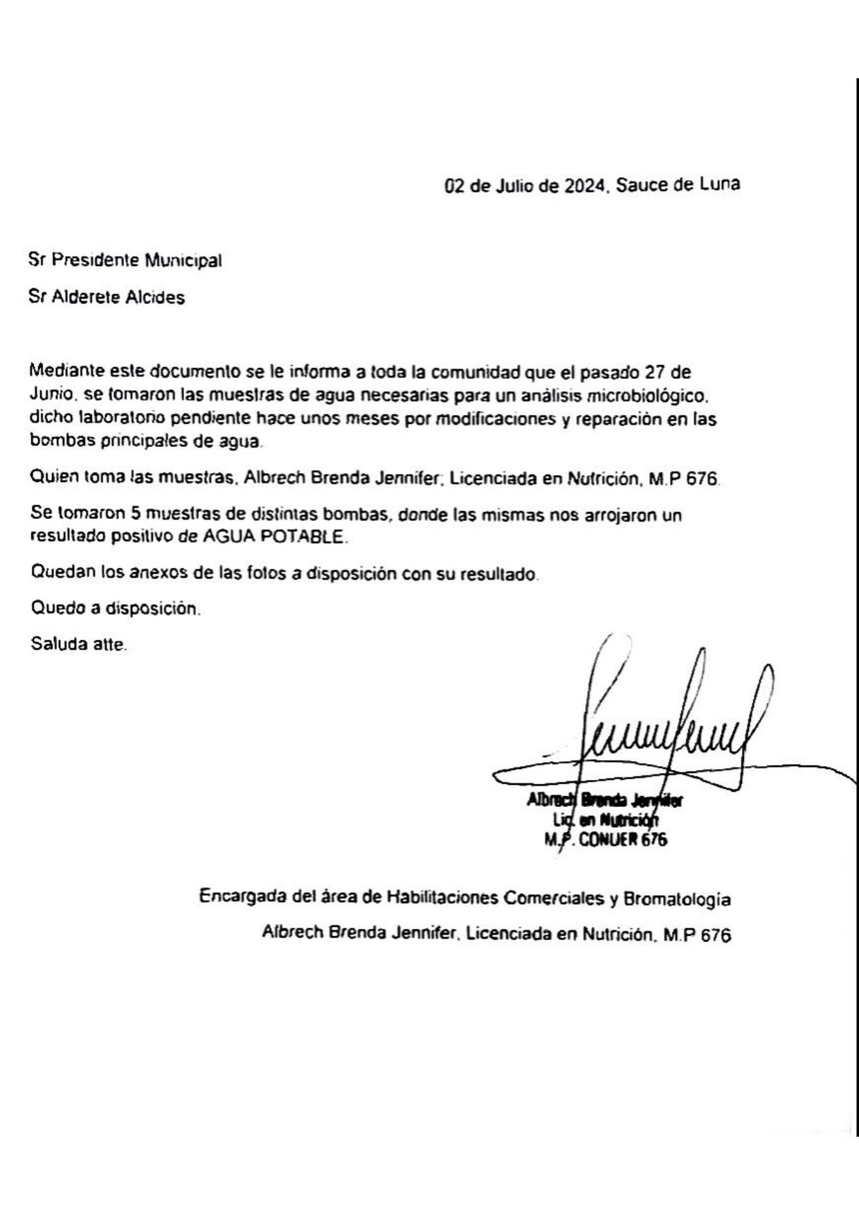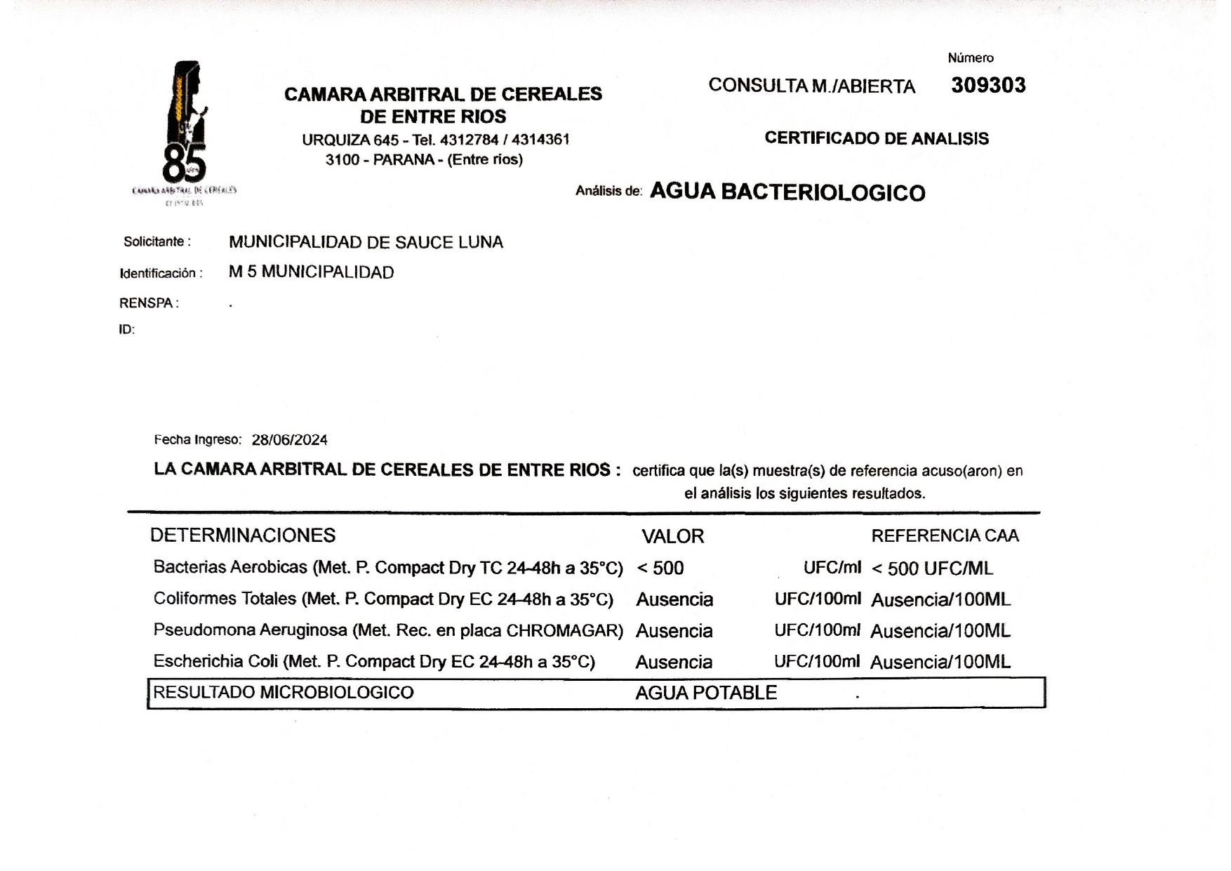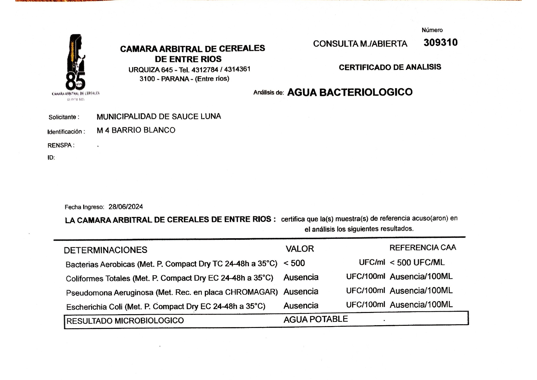 De acuerdo a la solicitud del Municipio de Sauce de Luna y a las muestras tomadas por profesionales, se hicieron los estudios pertinentes (análisis de agua bacteriológico) para determinar la potabilidad del servicio de agua de nuestra localidad.